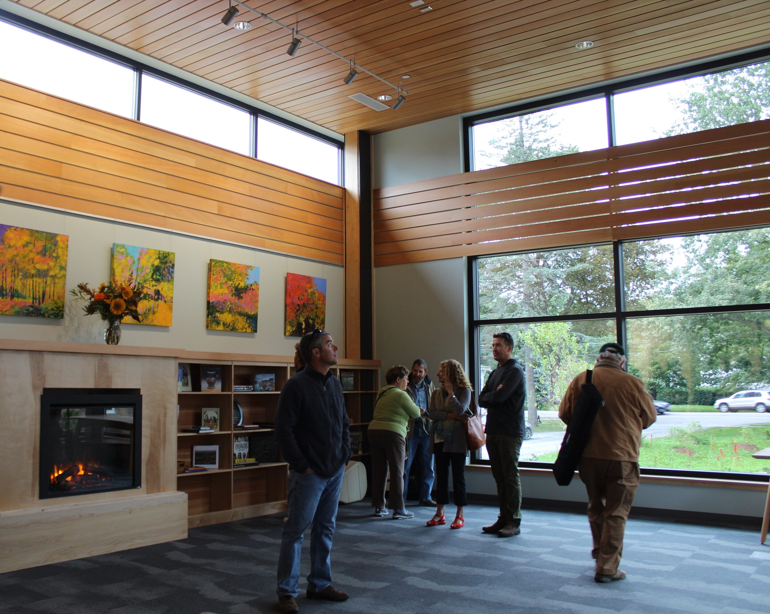 Several mini fireplaces placed throughout the building add a warm, homey feeling and the neutral finishes are decorated with art works to showcase local talent. The first pieces on exhibit include paintings by Lorraine Manely and colorful paper collages by artist Jo Thomas. Burlington City Arts is assisting with the gallery offerings.