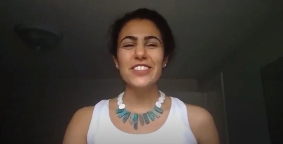 Cut to Ava Bakhtyari, the class president, who appears on screen wearing a white top and necklace adorned with green stones. Smiling, she thanks those participating, talks about how far the class of 2020 has come and explains how the ceremony will work.